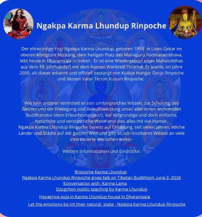 Der ehrwürdige Yogi Ngakpa Karma Lhundup, geboren 1959 in Lowo Gekar im oberen Königtum Mustang, dem heiligen Platz, dem heiligen Platz des Mahaguru Padmasambhava, lebt heute in Dharamsala in Indien. Er ist eine Wiedergeburt eines Mahasidddhas aus dem 19. Jahrhundert mit dem Namen Wariktsel Thokme. Er wurde im Jahre 2000, als diese anerkannt und offiziell bestätigt von Kyabje Hungar Dorje Rinpoche und dessen Vater Berton Kusum Rinpoche.
