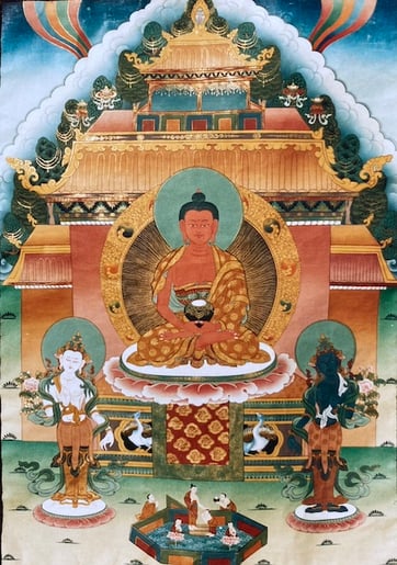 Buddha Amitabha (tib. Öpame), in English „Limitless Light“, is one of the five Dhyani-Buddhas and represents the Lotus-Family, the transformation of attachment and desire into discriminating wisdom. His Pure Land is named “Dewachen“, the realm of Great Bliss, which is similar to the state of liberation. By aspiration, confidence and meditation it is possible for us with the practice of the transference of consciousness (tib. Phowa) to reach in the moment of death with our consciousness the Pure Realm of Great Bliss.